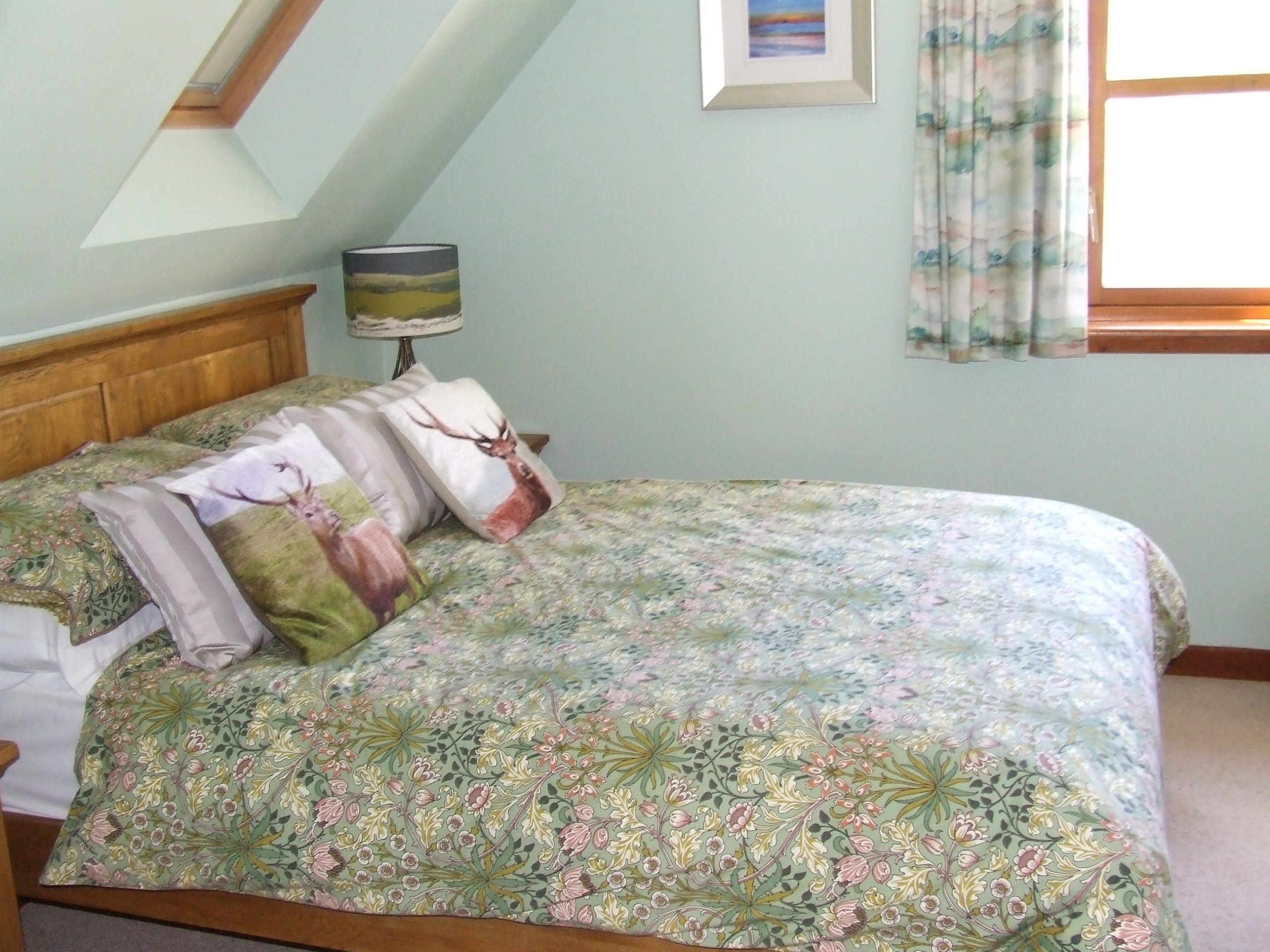 The velux window in the shower room offers views to the woodland behind the property when the blind is open. The views from the main bedroom window are of stunning hill land to the West of the property with sheep and cattle scattered about the hillside and sometimes sea eagles and buzzard hunting overhead. On a clear night watch the sunset dip behind the hill as night falls and if you leave the black out blind on the velux window over the bed open, lie in bed gazing up at the stars and planets.
